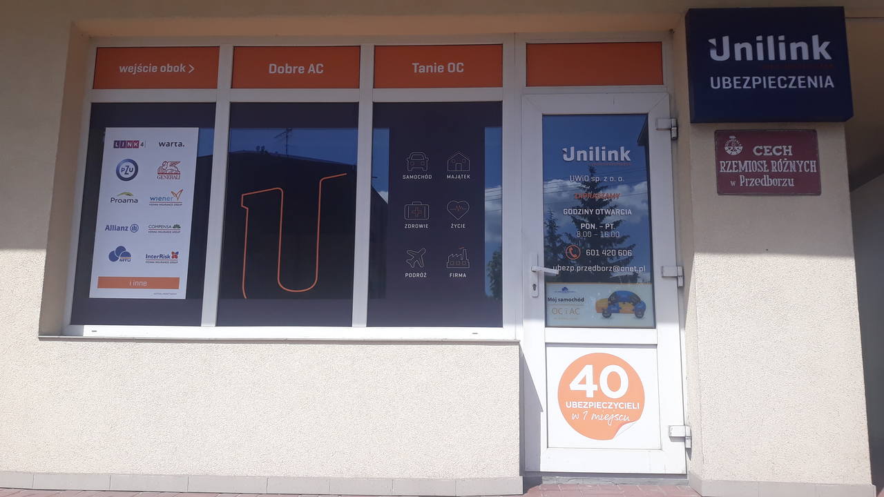 Zapraszamy do placówki Unilink w PRZEDBORZU lub do skontaktowania się z nami telefonicznie. Nasi doradcy szybko i sprawnie porównają dla Ciebie oferty na każde ubezpieczenie którego potrzebujesz i to we wszystkich Towarzystwach Ubezpieczeń dostępnych na rynku. U nas wybór jest największy!